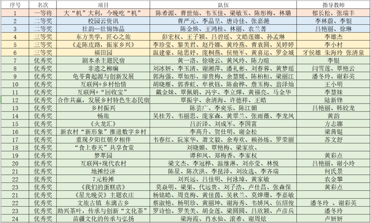 經(jīng)過一系列激烈的競爭,最終《大“機(jī)”大利,今晚吃“機(jī)”》項(xiàng)目獲得一等獎(jiǎng),《校園云資訊》《壯韻—壯錦飾品》項(xiàng)目獲得二等獎(jiǎng),《東方美學(xué),匠心之旅》《走陳皮路,振家鄉(xiāng)興》《福田園》項(xiàng)目獲得三等獎(jiǎng)。
