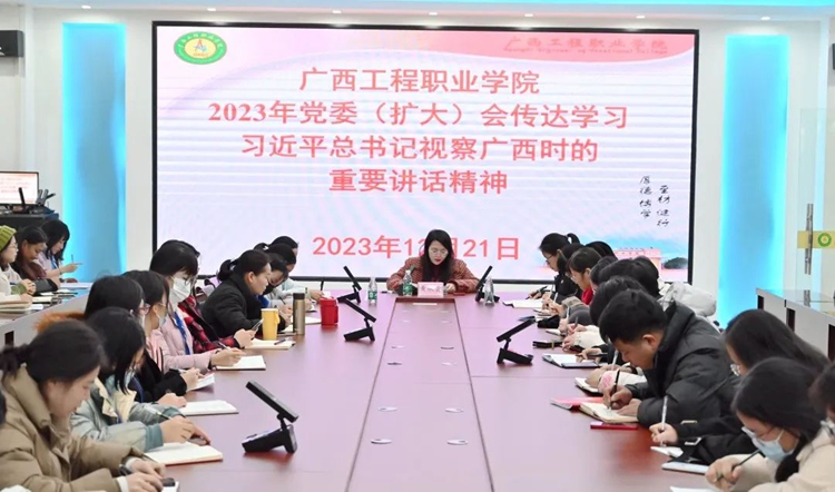 12月21日下午,廣西工程職業(yè)學(xué)院黨委(擴(kuò)大)會議在圖書館一樓大數(shù)據(jù)中心召開,會議傳達(dá)學(xué)習(xí)習(xí)近平總書記視察廣西時的重要講話精神。學(xué)校黨委副書記黃秋霞,黨委委員,各黨(總)支部書記、副書記、支委,各部門負(fù)責(zé)人參加會議。會議由黃秋霞副書記主持。