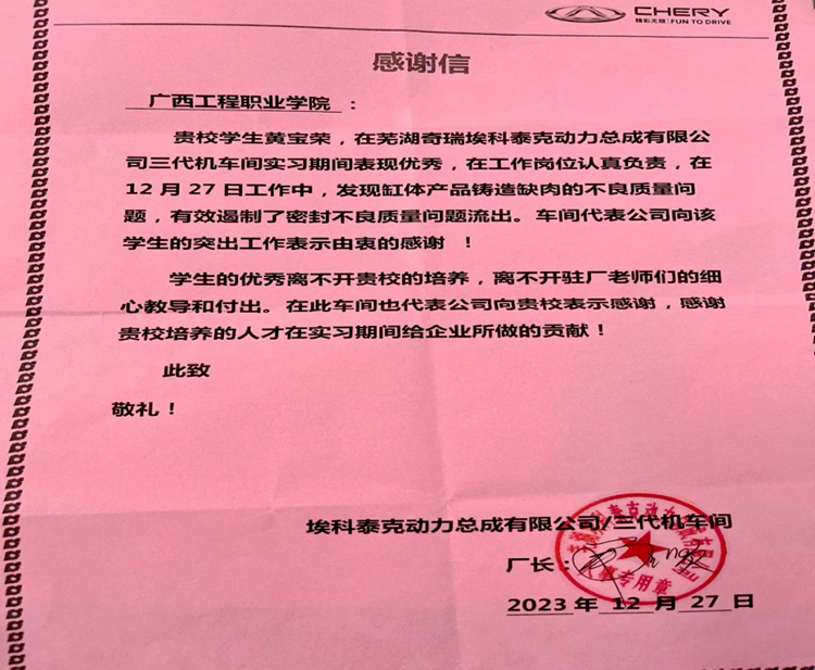 汽車與機(jī)電學(xué)院學(xué)子們?cè)鷮?shí)的專業(yè)技能和良好的職業(yè)素養(yǎng)得到了企業(yè)的一致認(rèn)可和高度評(píng)價(jià)。2023年12月27日,汽車與機(jī)電學(xué)院2021級(jí)汽車檢測(cè)與維修技術(shù)專業(yè)黃寶榮同學(xué),在工作中發(fā)現(xiàn)缸體產(chǎn)品鑄造缺肉的不良質(zhì)量問題,有效遏制了密封不良質(zhì)量問題流出。該企業(yè)對(duì)我校學(xué)生的突出工作表示由衷的感謝,為感謝學(xué)校對(duì)人才的辛勤培養(yǎng),特向?qū)W校寄來了感謝信。