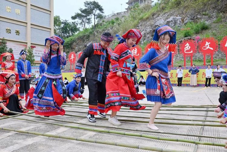 在輕快的竹竿敲擊節(jié)奏中,師生們身著美麗的民族服飾,跳起歡樂的竹竿舞。