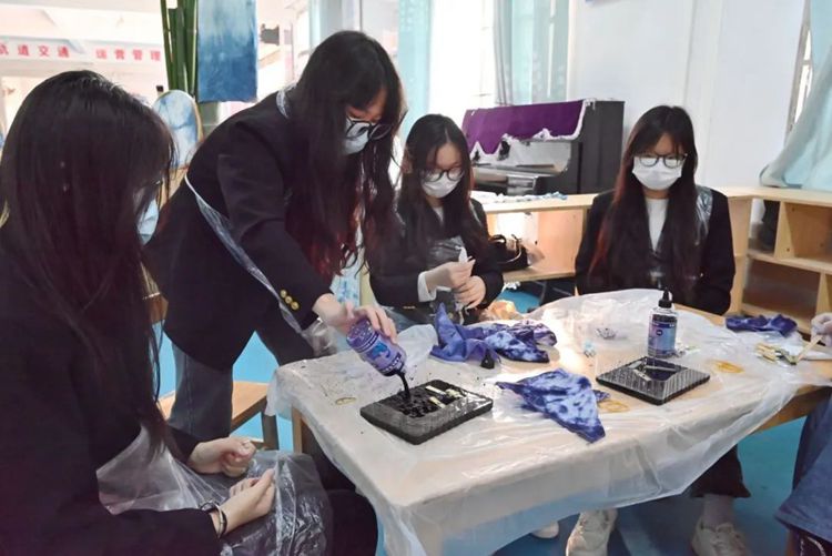 扎染工藝分為扎結(jié)和染色兩部分,學(xué)生們用紗線、皮筋將棉布捆扎成不同的花紋,浸入染料中,通過不同的著色、脫色,形成層次豐富、令人驚嘆的色暈和圖案。