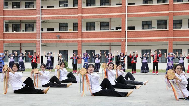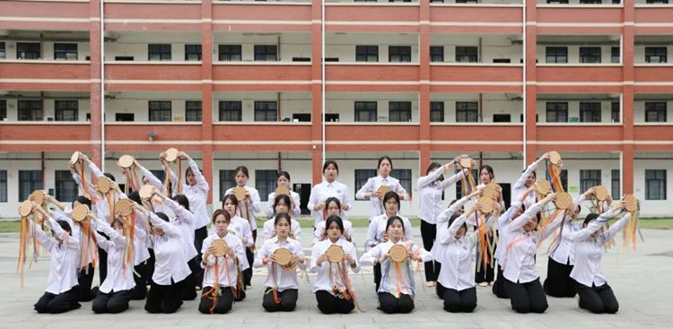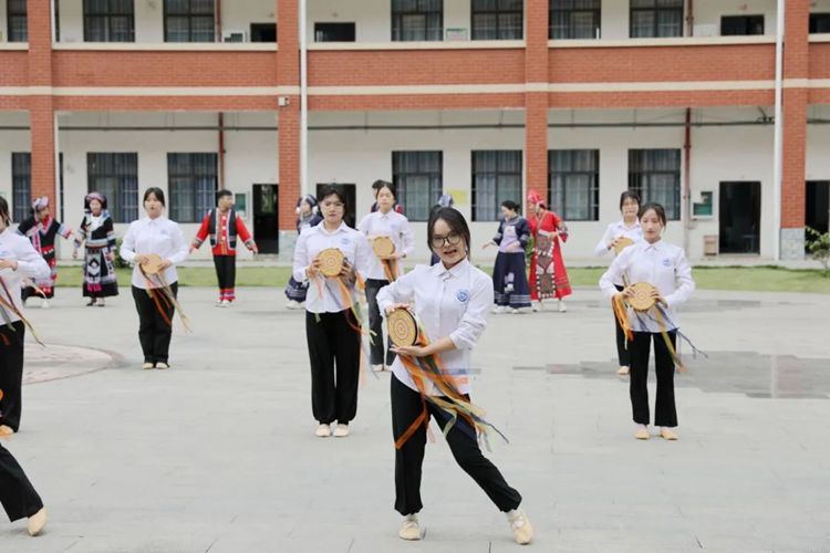 在學(xué)校教學(xué)區(qū)小廣場,蓮鼓越歌行的舞者們手持鼓棒和蓮花,配合鼓聲和歌曲的旋律,跳躍著獨(dú)特的舞步,展示出優(yōu)美、熱烈、充滿活力的舞蹈文化。