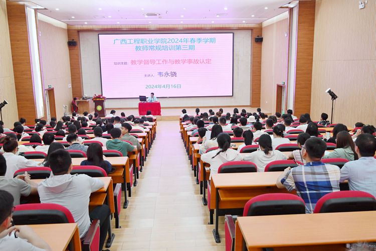 為進一步加強教風建設,規(guī)范課堂教學秩序,提升教師業(yè)務素養(yǎng),提高課堂教學效益,4月16日,學校在圖文信息大樓一樓學術報告廳開展2024年春季學期第三期教師常規(guī)培訓。教學督導室主任韋永驍副教授作教學督導工作及教學事故認定專題培訓,全體教職工參加培訓。
