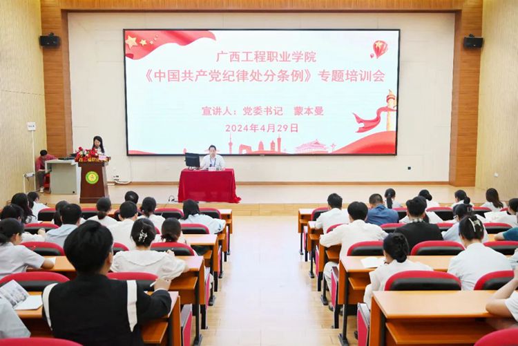為學(xué)習(xí)貫徹習(xí)近平總書記關(guān)于黨紀(jì)學(xué)習(xí)教育的重要講話精神,深入學(xué)習(xí)《中國共產(chǎn)黨紀(jì)律處分條例》,引導(dǎo)黨員干部自覺做到學(xué)紀(jì)、知紀(jì)、明紀(jì)、守紀(jì),4月29日下午,學(xué)校黨委在圖文信息大樓三樓學(xué)術(shù)報(bào)告廳舉行《中國共產(chǎn)黨紀(jì)律處分條例》專題培訓(xùn)會(huì),黨委書記、督導(dǎo)專員蒙本曼同志作專題培訓(xùn),全體黨員參加培訓(xùn),培訓(xùn)會(huì)由黨委副書記黃秋霞同志主持。