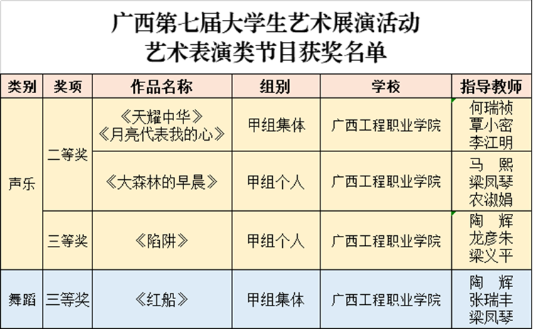 近日,自治區(qū)教育廳公布了廣西第七屆大學(xué)生藝術(shù)展演活動獲獎情況,廣西工程職業(yè)學(xué)院選送的節(jié)目獲評藝術(shù)表演類二等獎2項、三等獎2項。