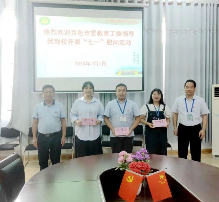 2024年7月1日,是中國(guó)共產(chǎn)黨成立103周年紀(jì)念日。為加強(qiáng)黨內(nèi)關(guān)懷,傳遞組織溫暖,進(jìn)一步弘揚(yáng)黨的光榮傳統(tǒng)和優(yōu)良作風(fēng),7月1日下午,百色市委教育工委委員、市教育局黨組成員、總督學(xué)梁富文和市教育督導(dǎo)中心副主任王小東到我校開(kāi)展“七一”慰問(wèn)困難黨員活動(dòng),帶來(lái)黨和政府的組織關(guān)懷和節(jié)日問(wèn)候。學(xué)校黨委書(shū)記、督導(dǎo)專員蒙本曼陪同慰問(wèn)。