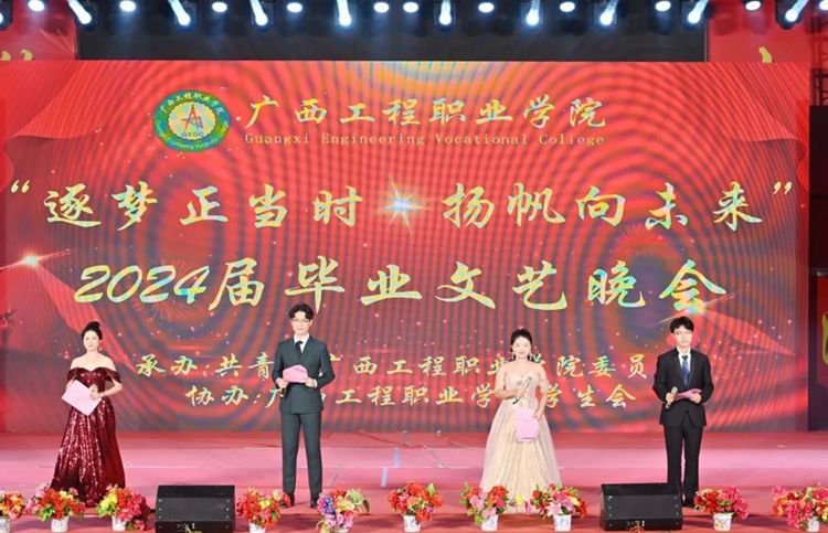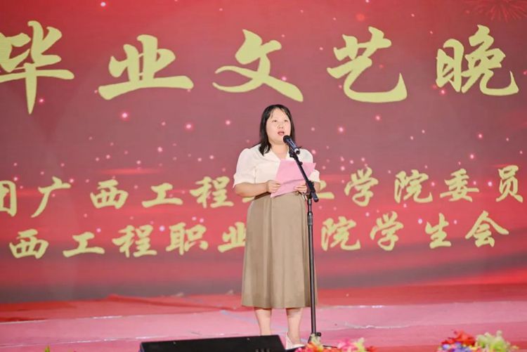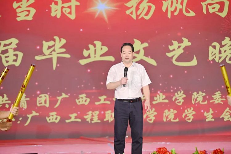黨委書記、督導(dǎo)專員蒙本曼宣布廣西工程職業(yè)學(xué)院“逐夢正當時·揚帆向未來”2024屆畢業(yè)文藝晚會正式開始。