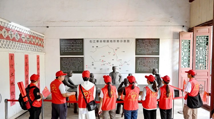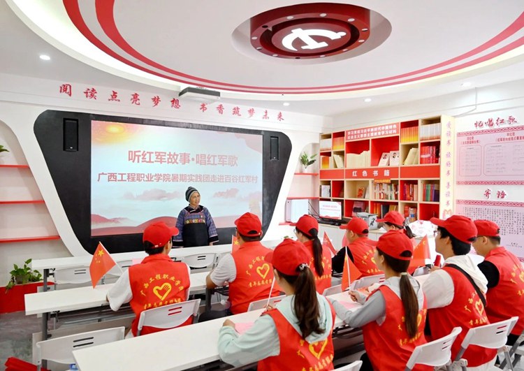 在百谷紅軍村,百谷紅軍村革命后代家屬帶領(lǐng)全體實(shí)踐團(tuán)、服務(wù)團(tuán)成員參觀了百谷紅軍村陳列室,她講解了百谷紅軍紅色革命故事。1929年12月,鄧小平、張?jiān)埔莸葻o(wú)產(chǎn)階級(jí)革命家領(lǐng)導(dǎo)和發(fā)動(dòng)了百色起義,建立紅七軍和右江蘇維埃政權(quán),創(chuàng)建右江革命根據(jù)地。百谷村131人參加革命,其中50多人參加紅七軍和農(nóng)民協(xié)會(huì),為鞏固和發(fā)展右江革命根據(jù)地的建設(shè)作出了積極貢獻(xiàn)。她將百谷村的歷史及百谷村發(fā)展現(xiàn)狀等向?qū)嵺`團(tuán)、服務(wù)團(tuán)成員進(jìn)行了講解,并深入交流了鄉(xiāng)村的文化建設(shè)。此外,百谷紅軍村革命后代家屬還帶領(lǐng)了全體師生黨員齊唱了《紅軍紅又紅》《工農(nóng)革命要團(tuán)結(jié)》《誰(shuí)是革命主力軍》《共產(chǎn)黨領(lǐng)導(dǎo)真正確》等紅歌。