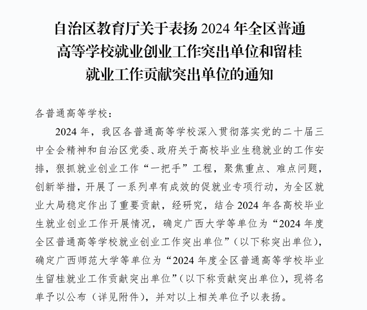 近日,根據(jù)廣西壯族自治區(qū)教育廳下發(fā)的《自治區(qū)教育廳關于表揚2024年全區(qū)普通高等學校就業(yè)創(chuàng)業(yè)工作突出單位和留桂就業(yè)工作貢獻突出單位的通知》(桂教學生〔2024〕25號)文件,我校被認定為“全區(qū)普通高等學校畢業(yè)生留桂就業(yè)工作貢獻突出單位”,這是我校就業(yè)工作連續(xù)第3年獲得自治區(qū)級表彰。
