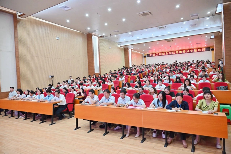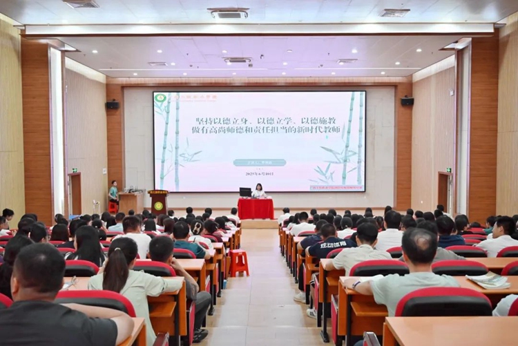 為進一步加強我校師德師風(fēng)建設(shè),提升教師職業(yè)道德水平,培養(yǎng)一支業(yè)務(wù)精良、師德師風(fēng)過硬的師資隊伍,6月10日,學(xué)校在圖文信息大樓一樓學(xué)術(shù)報告廳開展主題為“堅持以德立身、以德立學(xué)、以德施教,做有高尚師德和責(zé)任擔(dān)當(dāng)?shù)男聲r代教師”的專題培訓(xùn),本次培訓(xùn)由黨委副書記、校長羅艷妮主講。