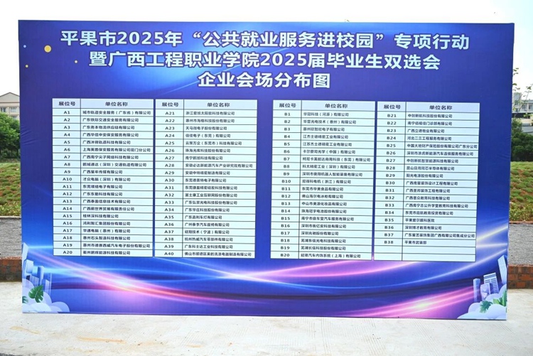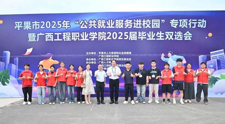 為做好畢業(yè)生就業(yè)工作,搶抓就業(yè)關(guān)鍵期,搭建畢業(yè)生和用人單位精準(zhǔn)對(duì)接平臺(tái),全力促進(jìn)我校畢業(yè)生更充分、更高質(zhì)量就業(yè),2025年6月24日上午,由平果市人力資源和社會(huì)保障局、廣西工程職業(yè)學(xué)院共同舉辦的平果市2025年“公共就業(yè)服務(wù)進(jìn)校園”專項(xiàng)行動(dòng)暨廣西工程職業(yè)學(xué)院2025屆畢業(yè)生雙選會(huì)在體育館主干道舉行。