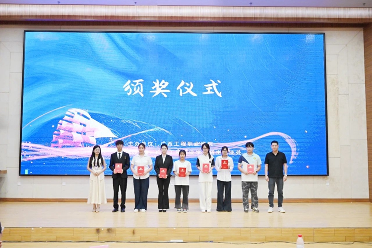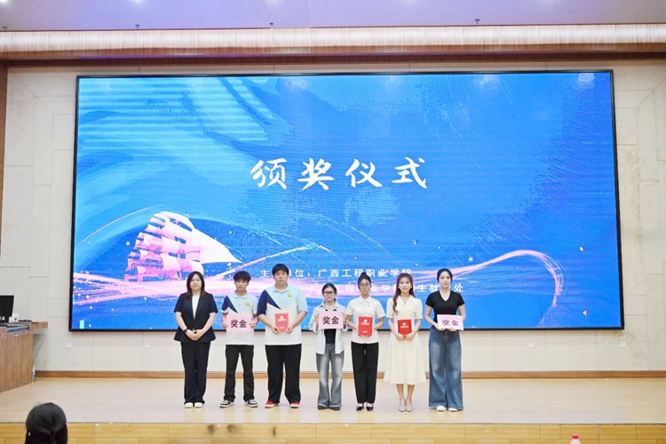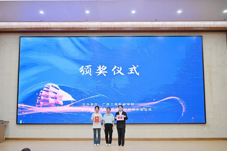 圖為廣西工程職業(yè)學(xué)院招生就業(yè)處副處長(zhǎng)陳麗燕為學(xué)生頒發(fā)二等獎(jiǎng)