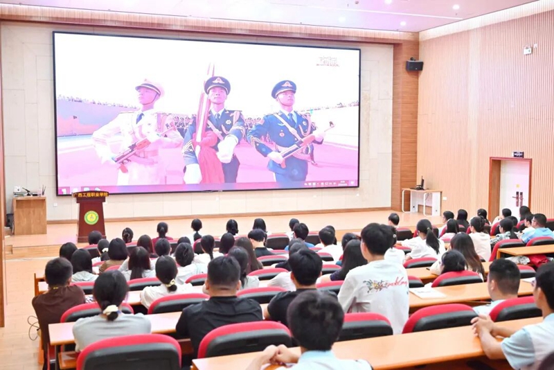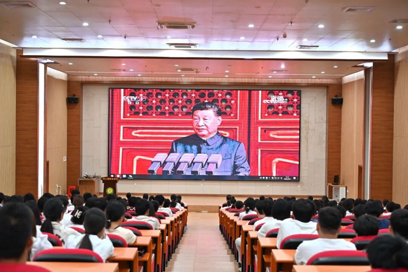 師生們認(rèn)真聆聽(tīng)了習(xí)近平總書(shū)記在紀(jì)念中國(guó)人民抗日戰(zhàn)爭(zhēng)暨世界反法西斯戰(zhàn)爭(zhēng)勝利80周年大會(huì)上的重要講話,并全程全神貫注地觀看了閱兵儀式。習(xí)近平總書(shū)記的重要講話激勵(lì)著每一位師生,威武之師整齊劃一的步伐、鏗鏘有力的口號(hào),大國(guó)重器彰顯的前沿科技、先進(jìn)裝備震撼著師生們的心靈,大家接受著靈魂的洗禮,不時(shí)爆發(fā)出熱烈掌聲。