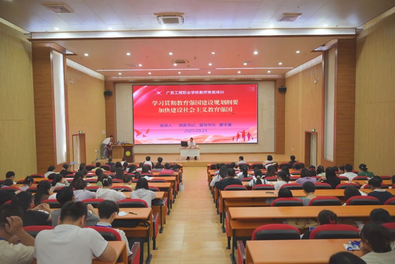 為深入學(xué)習(xí)貫徹《教育強(qiáng)國(guó)建設(shè)規(guī)劃綱要(2024-2035 年)》精神,推動(dòng)教育領(lǐng)域全面深化改革向縱深發(fā)展,夯實(shí)教師隊(duì)伍建設(shè)根基,9月23日下午,廣西工程職業(yè)學(xué)院2025年秋季學(xué)期第一期教師常規(guī)培訓(xùn)在圖文信息大樓一樓學(xué)術(shù)報(bào)告廳舉行。黨委書(shū)記、政府督導(dǎo)專(zhuān)員蒙本曼作題為《學(xué)習(xí)貫徹教育強(qiáng)國(guó)建設(shè)規(guī)劃綱要 加快建設(shè)社會(huì)主義教育強(qiáng)國(guó)》的專(zhuān)題講座。