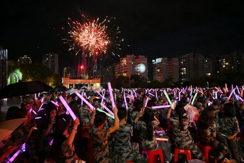 話音剛落,幾聲清脆的聲響劃破夜空,絢爛的煙火驟然綻放。金色、銀色、紅色的火花在墨色夜幕中交織,時(shí)而如流星般劃過天際,留下璀璨軌跡;時(shí)而似花朵般盡情舒展,綻放層層絢爛,將整個(gè)校園映照得宛如夢(mèng)幻仙境?,F(xiàn)場(chǎng)的新生們紛紛舉起手機(jī),迫不及待記錄下這震撼又浪漫的瞬間,歡呼聲、驚嘆聲此起彼伏,瞬間點(diǎn)燃了全場(chǎng)的熱烈氛圍,也為這場(chǎng)晚會(huì)拉開了極具儀式感的序幕。