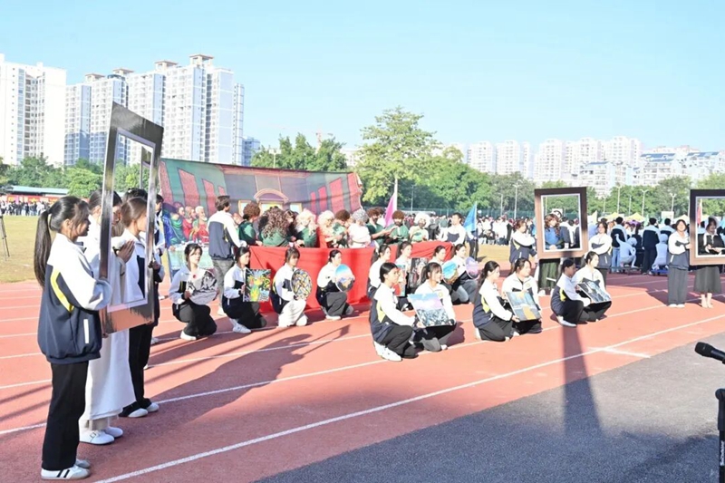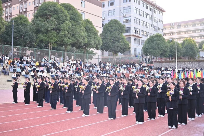 她們手捧鮮花,步履輕快,洋溢著青春朝氣,展現(xiàn)著全校學(xué)子的蓬勃風(fēng)采。