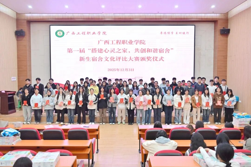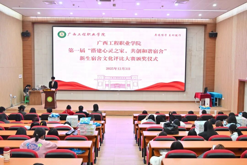 為營造溫馨向上的宿舍氛圍,幫助2025級(jí)新生融入宿舍集體生活,廣西工程職業(yè)學(xué)院舉行第一屆以“搭建心靈之家,共創(chuàng)和諧宿舍”為主題的新生宿舍文化評(píng)比活動(dòng)。活動(dòng)于2025年10月20日啟動(dòng),由學(xué)生工作處承辦。評(píng)比活動(dòng)歷時(shí)一個(gè)多月,經(jīng)過院級(jí)初賽、校級(jí)決賽,最終評(píng)選出一等獎(jiǎng)10個(gè)宿舍、二等獎(jiǎng)21個(gè)宿舍、三等獎(jiǎng)28個(gè)宿舍。頒獎(jiǎng)儀式于2025年12月3日在圖文信息大樓一樓報(bào)告廳舉行。