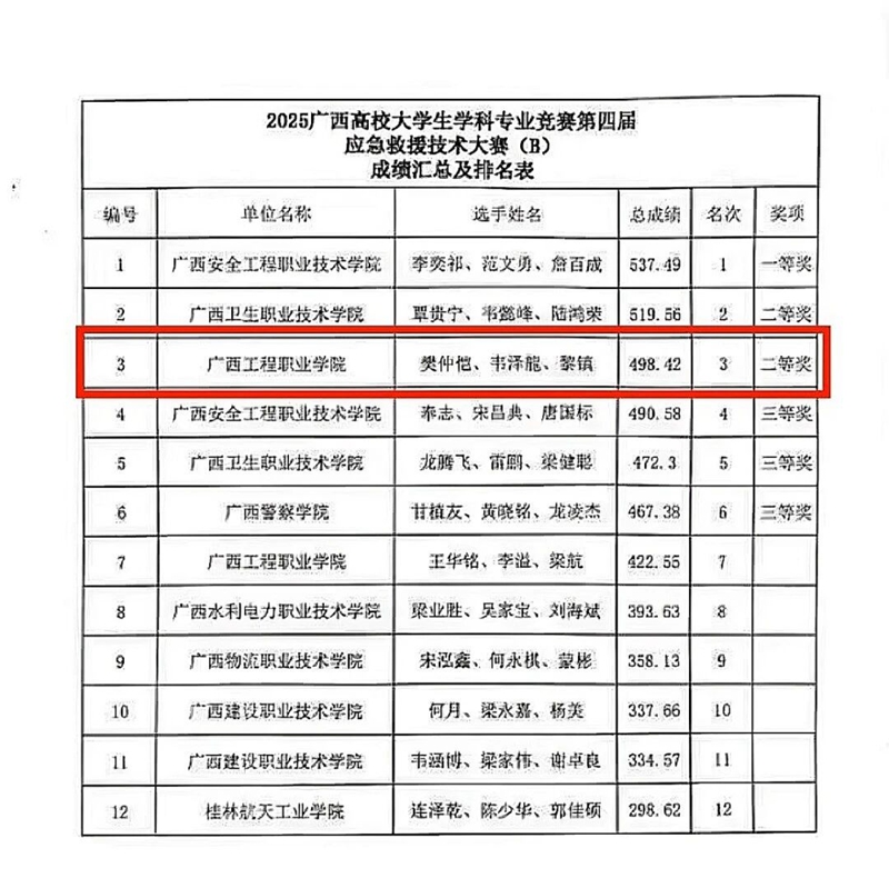 近日,由自治區(qū)教育廳、自治區(qū)應(yīng)急管理廳指導(dǎo),廣西安全工程職業(yè)技術(shù)學(xué)院等單位承辦的2025年廣西高校大學(xué)生學(xué)科專業(yè)競(jìng)賽第四屆應(yīng)急救援技術(shù)大賽圓滿落幕。我校鐵道與航空學(xué)院積極組織2支隊(duì)伍參加應(yīng)急救援技能(B)賽項(xiàng)。最終,在來自全區(qū)9所高職院校的12支代表隊(duì)激烈角逐中,由黎鎮(zhèn)、韋澤龍、樊仲愷三名同學(xué)組成的代表隊(duì)脫穎而出,他們憑借扎實(shí)的專業(yè)功底和出色的應(yīng)急處置能力,斬獲該賽項(xiàng)二等獎(jiǎng),為學(xué)校贏得榮譽(yù)。