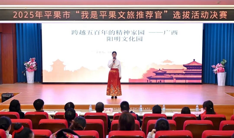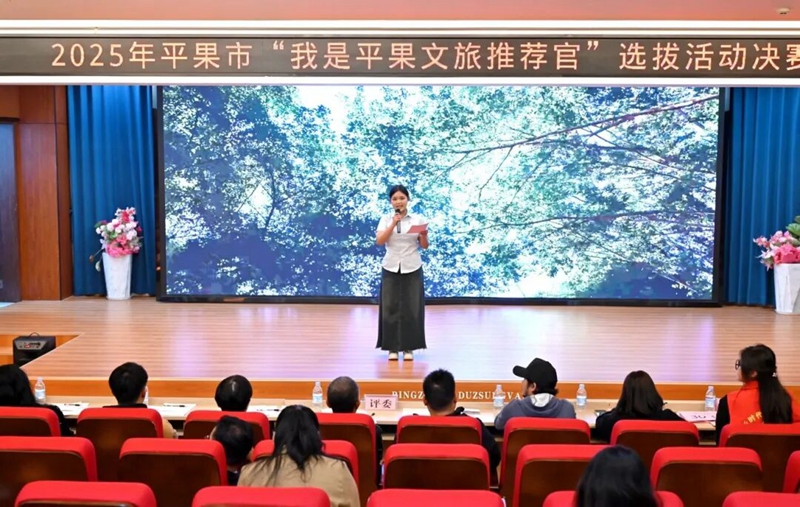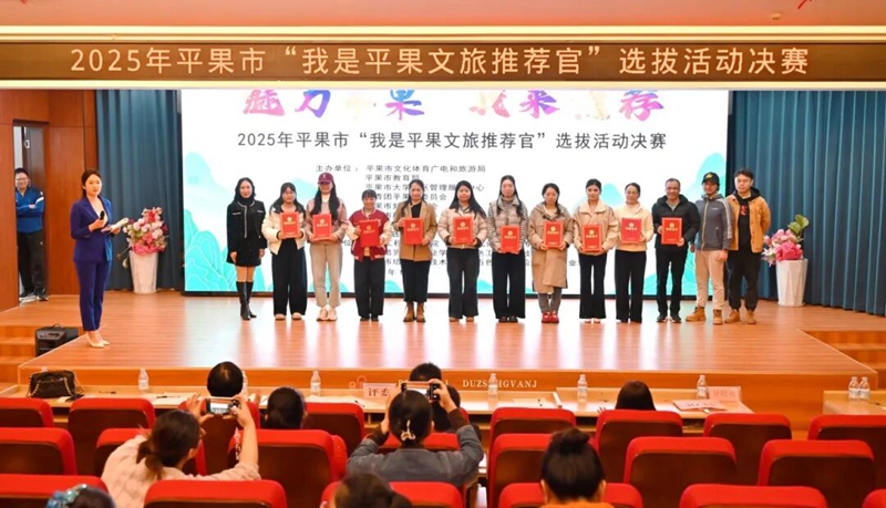 為全方位展現(xiàn)平果文旅獨(dú)特魅力,挖掘本土文旅推廣新生力量,2025年12月12日,“我是平果文旅推薦官”選拔活動(dòng)決賽在平果市圖書(shū)館報(bào)告廳舉行。本次比賽共有20名選手參與決賽,我校鐵道與航空學(xué)院黃一釗、經(jīng)濟(jì)管理學(xué)院王曉妹、藝術(shù)設(shè)計(jì)學(xué)院周培和韋麗欣等四名同學(xué)參加此次比賽,通過(guò)不懈努力,我校學(xué)子榮獲