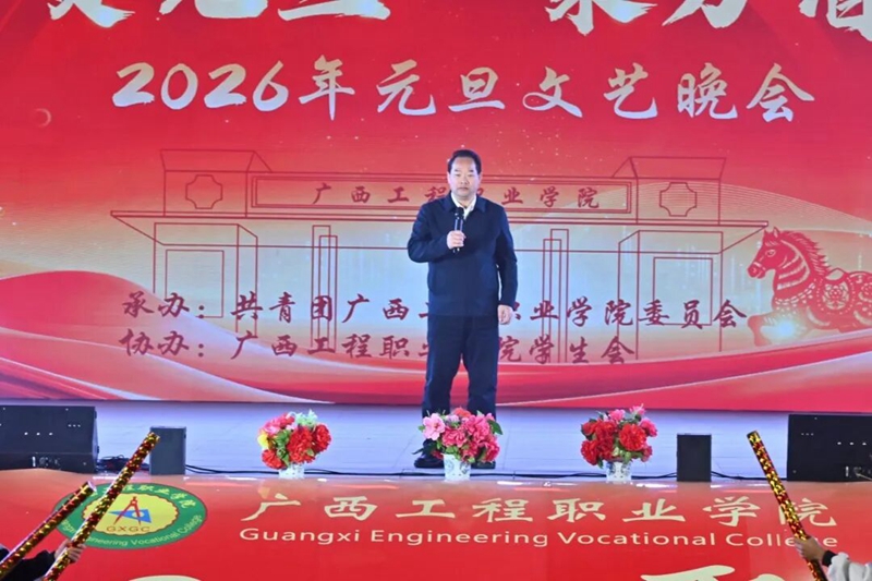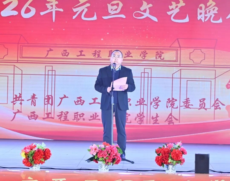 黨委書(shū)記、政府督導(dǎo)專(zhuān)員蒙本曼宣布廣西工程職業(yè)學(xué)院2026年元旦文藝晚會(huì)正式開(kāi)始。