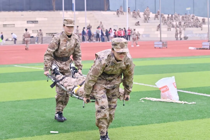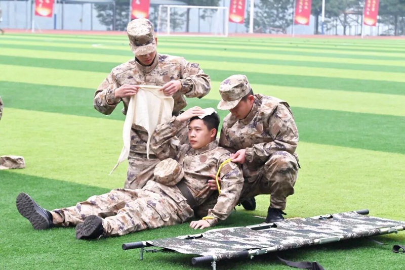 在模擬實戰(zhàn)環(huán)境的戰(zhàn)場救護項目中,我校隊員操作熟練、配合默契,迅速完成傷員搜索、止血包扎、固定搬運等一系列動作,展現(xiàn)出高效的戰(zhàn)場救護能力,榮獲第二名。