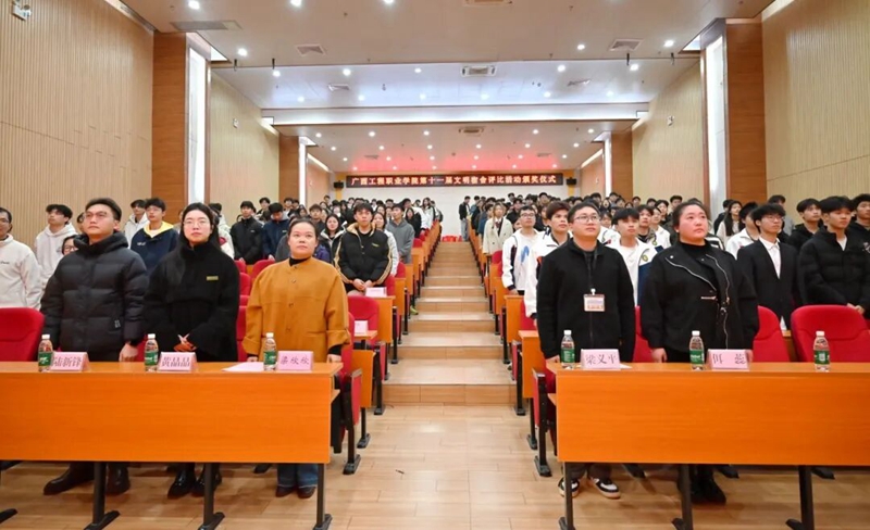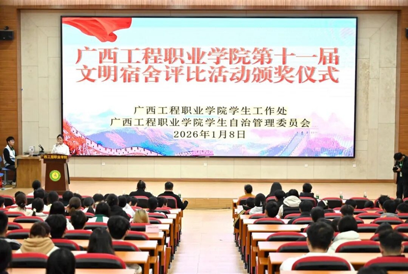 2026年1月8日晚,廣西工程職業(yè)學院第十一屆文明宿舍評比活動頒獎典禮在圖文信息大樓學術報告廳舉行。本次活動以“寓見文明,青春同行”為主題,旨在表彰先進、樹立典范,深入推進校園精神文明建設和宿舍文化育人工作。學生工作處相關負責人、各二級學院學生工作負責人、輔導員代表及獲獎學生代表共同參加了此次典禮。