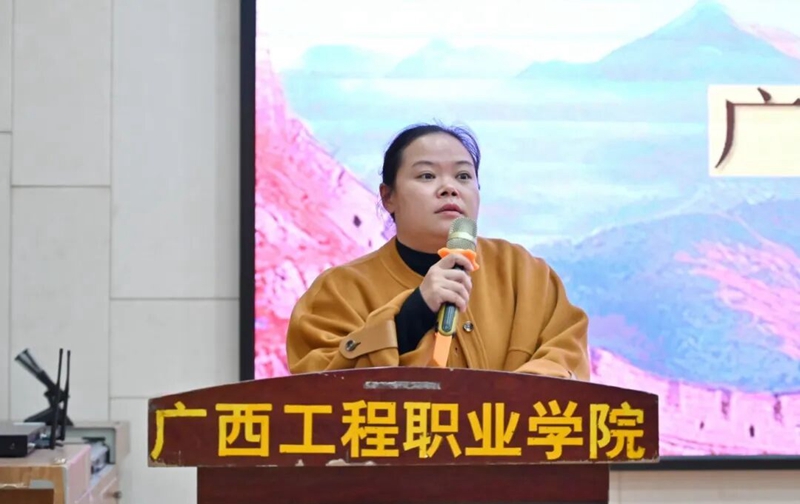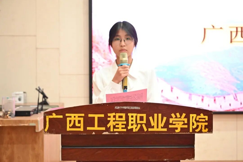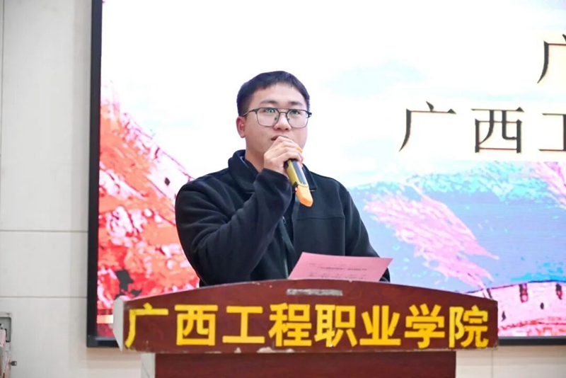 圖為學生工作處科長梁義平宣讀《關于表彰廣西工程職業(yè)學院第十一屆文明宿舍的決定》