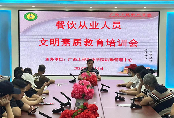 為進(jìn)一步加強(qiáng)餐飲從業(yè)人員對(duì)學(xué)校的歸宿感、認(rèn)同感,提高學(xué)校餐飲服務(wù)質(zhì)量,改善后勤服務(wù)形象,確保學(xué)生用餐環(huán)境綠色、安全,2023年6月14日后勤管理中心召集所有商鋪和食堂工作代表,在圖書館大數(shù)據(jù)中心進(jìn)行了餐飲從業(yè)人員文明素質(zhì)教育培訓(xùn)。