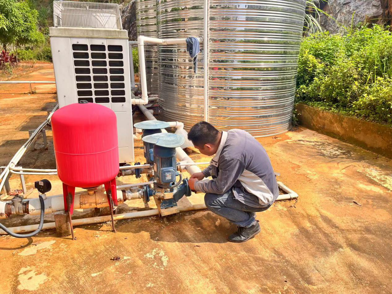 圖為電工師傅檢查空氣能加壓泵