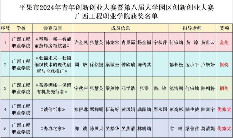 經(jīng)過緊張激烈的角逐,最終,我校“蠶燃一新——智能蠶繭烤房領(lǐng)航者”項(xiàng)目憑借其獨(dú)特的技術(shù)優(yōu)勢(shì)和廣闊的市場(chǎng)前景,榮獲金獎(jiǎng),“壯錦未來——壯錦編織技術(shù)的現(xiàn)代創(chuàng)新與全球推廣”項(xiàng)目榮獲銀獎(jiǎng),《茶香滿桂——保留有機(jī)茶先行者》項(xiàng)目團(tuán)隊(duì)獲得銅獎(jiǎng),《辦辦之家》及《誠信紙巾》項(xiàng)目團(tuán)隊(duì)分別獲得優(yōu)秀獎(jiǎng)。