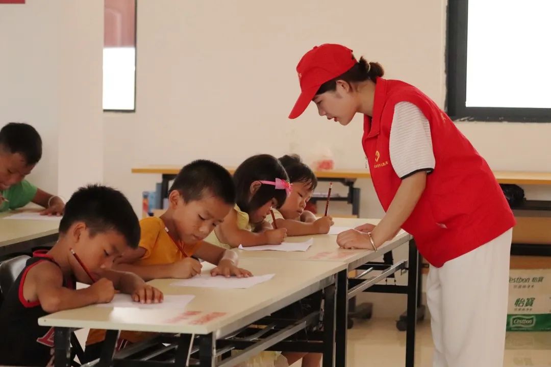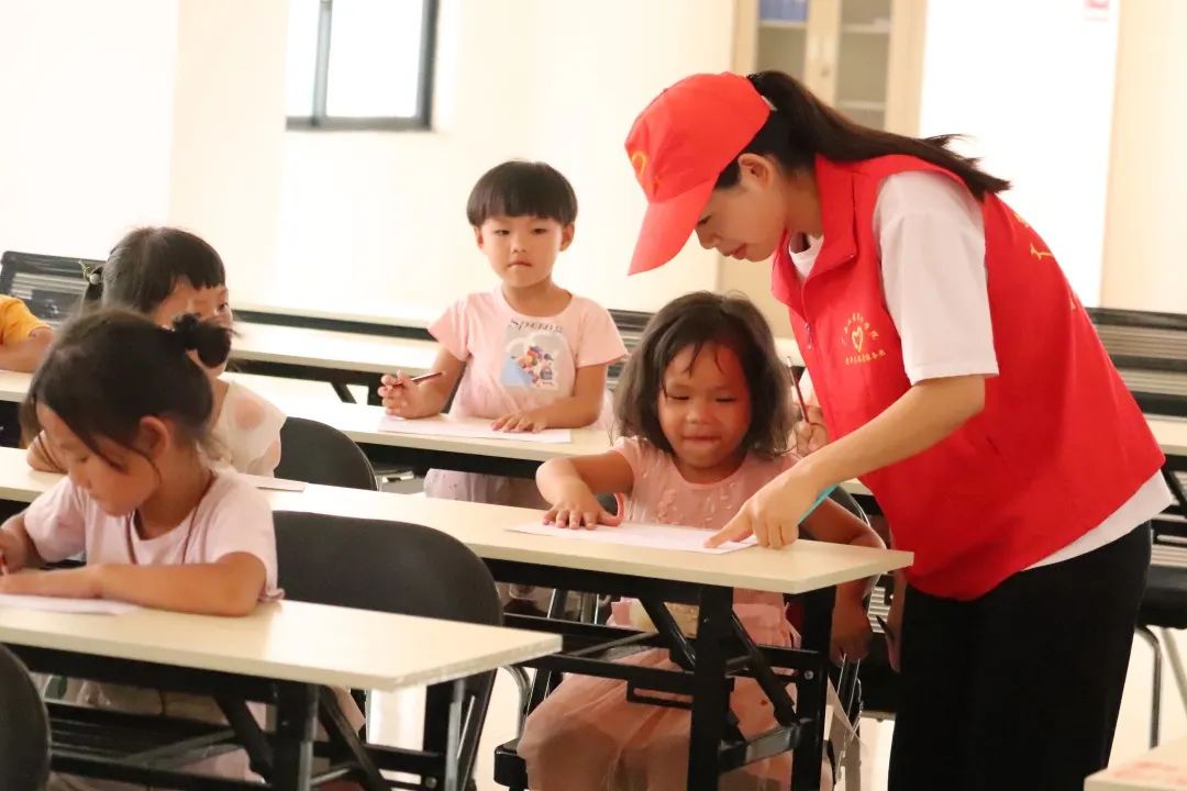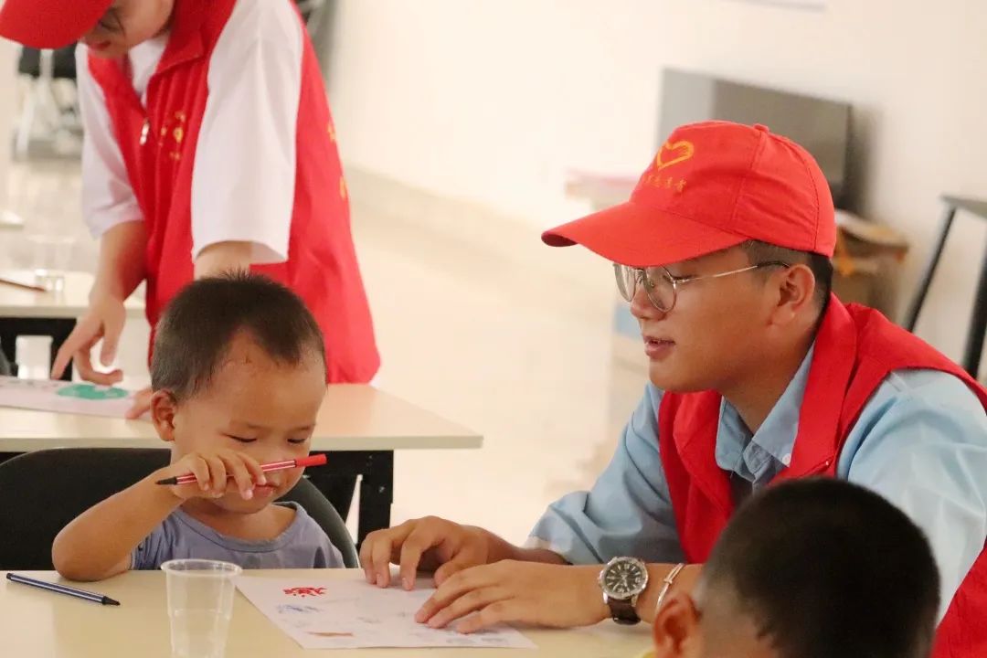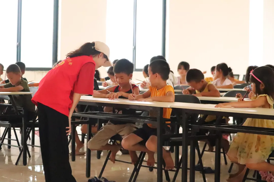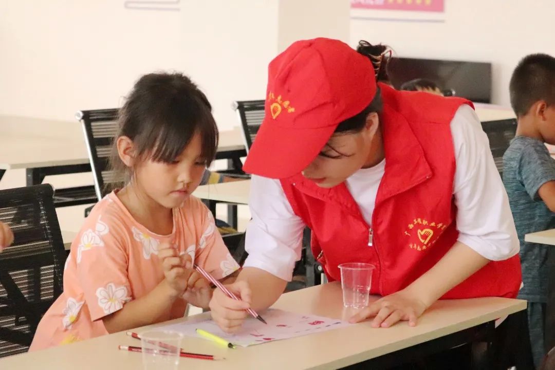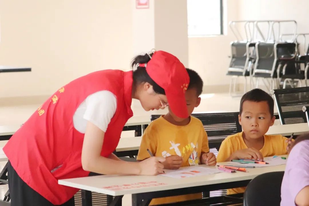 在孩子們畫(huà)畫(huà)的過(guò)程中,團(tuán)隊(duì)成員對(duì)他們進(jìn)行指導(dǎo)