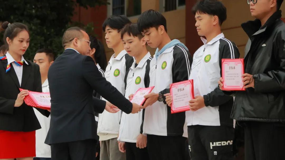 學(xué)校副校長(zhǎng)黃德偉宣讀《廣西工程職業(yè)學(xué)院2021年“祖國,我為您驕傲”主題升旗儀式表彰決定》,共有1846名師生被授予 “愛黨愛國愛校”榮譽(yù)稱號(hào)。學(xué)校黨委委員、副校長(zhǎng)彭高彬?yàn)楂@得表彰的師生代表進(jìn)行了頒獎(jiǎng)。