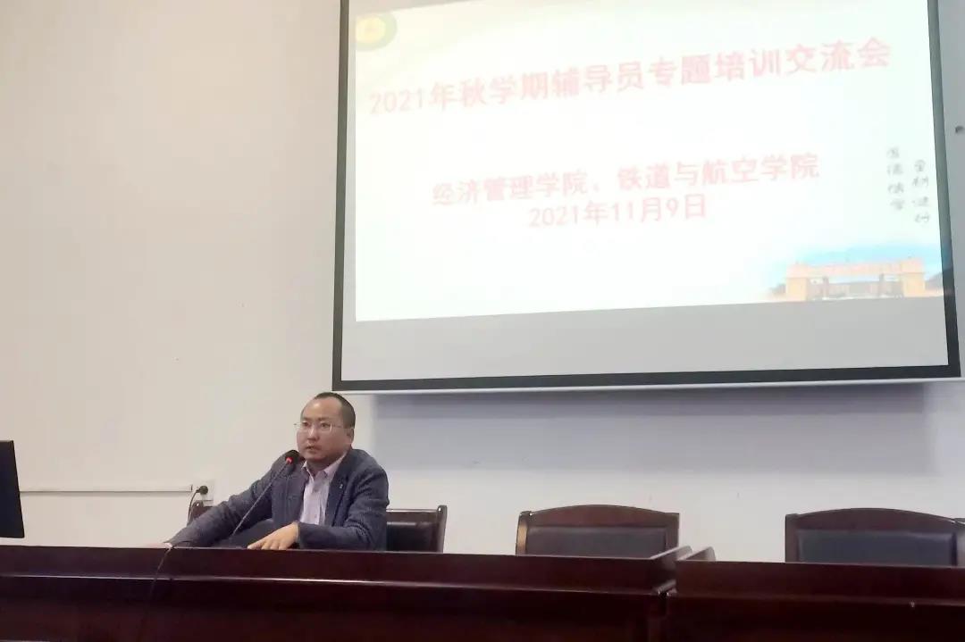 為提升我校思想政治工作質(zhì)量和輔導(dǎo)員隊(duì)伍建設(shè)水平,培養(yǎng)輔導(dǎo)員隊(duì)伍的職業(yè)榮譽(yù)感與歸屬感,增強(qiáng)輔導(dǎo)員的團(tuán)隊(duì)協(xié)作意識(shí),推動(dòng)輔導(dǎo)員隊(duì)伍專業(yè)化、職業(yè)化發(fā)展,11月9日下午,經(jīng)濟(jì)管理學(xué)院、鐵道與航空管理學(xué)院在圖書館學(xué)術(shù)報(bào)告廳聯(lián)合召開2021年秋季學(xué)期輔導(dǎo)員專題培訓(xùn)交流會(huì),學(xué)校黨委委員、副校長(zhǎng)彭高彬參與并指導(dǎo)此次交流會(huì),兩個(gè)二級(jí)學(xué)院的黨支部書記、分團(tuán)委書記、全體輔導(dǎo)員參加交流會(huì)。