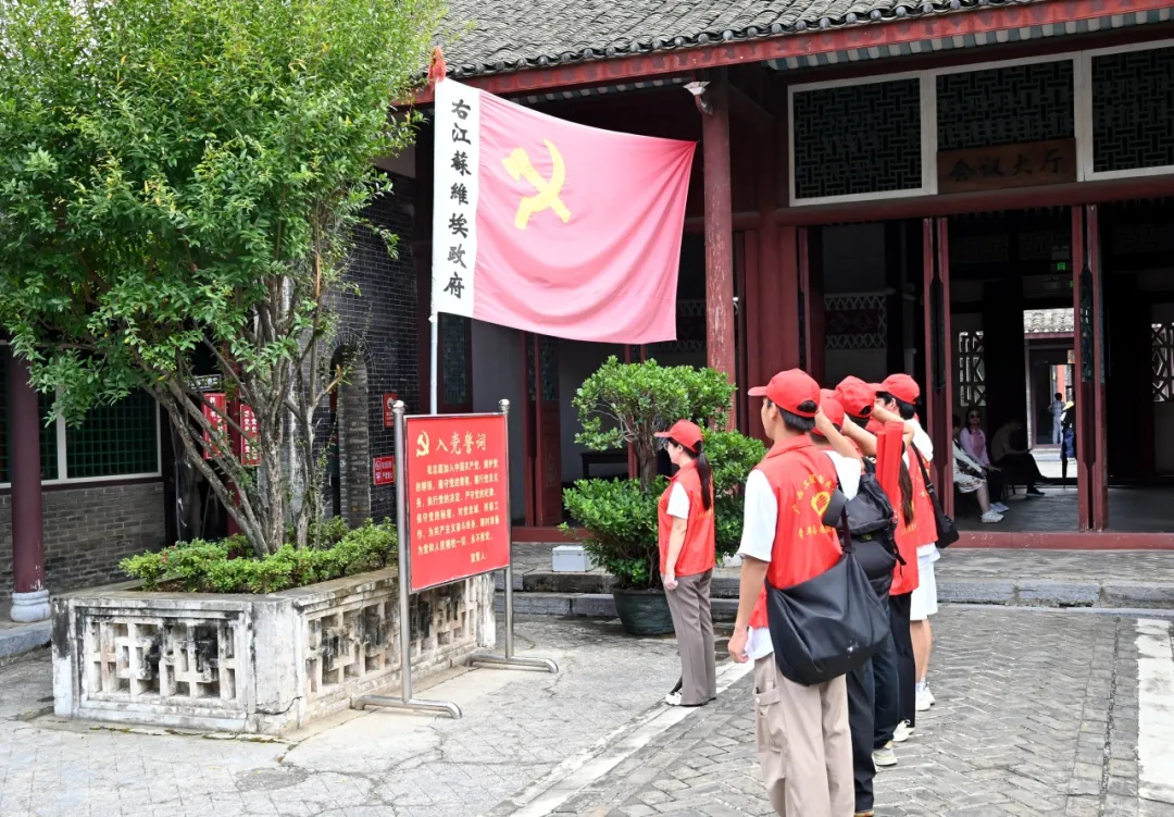 在右江革命紀念館——經(jīng)正書院,全體實踐團、服務團成員懷著對先烈的崇敬之情,認真觀看了館藏歷史圖片、史料及革命文物,進一步了解了中國革命道路的艱難探索、百色起義的歷史背景、老一輩無產(chǎn)階級革命家艱苦卓絕的戰(zhàn)斗經(jīng)過、百色土地革命運動發(fā)展等黨帶領全國人民走向勝利的光輝歷程。大家跟隨講解員一起聆聽戰(zhàn)斗故事,重溫崢嶸歲月,深切感受著革命先烈為革命事業(yè)不畏艱難、犧牲一切的偉大品格。