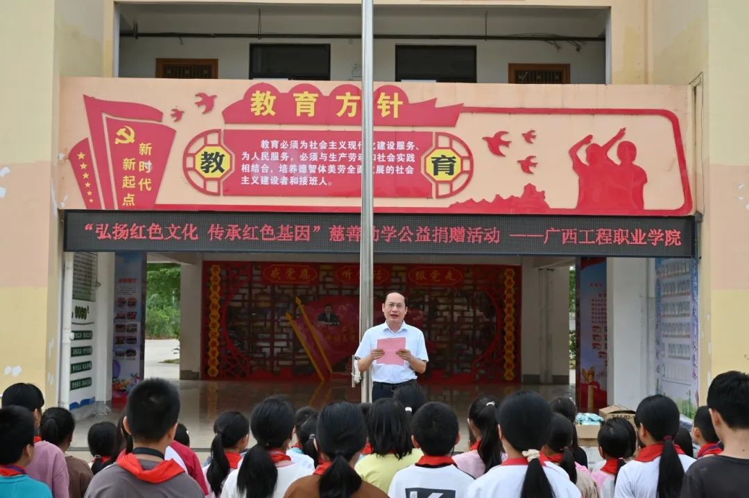 為弘揚(yáng)紅色精神,踐行公益使命,助力教育事業(yè)發(fā)展,2025年4月29日,廣西工程職業(yè)學(xué)院赴平果市吉祥小學(xué)開展“弘揚(yáng)紅色文化 傳承紅色基因”慈善助學(xué)捐贈活動,捐贈圖書及學(xué)習(xí)用品等,為孩子們送去了學(xué)習(xí)物資與關(guān)懷,希望孩子們通過紅色文化的浸潤,博覽群書,增長知識面,奮發(fā)向上,實(shí)現(xiàn)人生夢想?;顒佑善焦忻裾峙c平果市慈善促進(jìn)會主辦。我校副校長黃德偉、團(tuán)委副書記李麗清及教師代表參加了捐贈活動