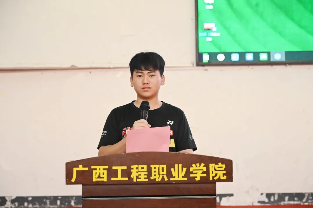 副校長黃德偉講話。他向在本次比賽中取得優(yōu)異成績的運動員和團隊表示熱烈的祝賀!向全體裁判員、工作人員致以誠摯的感謝!賽場上,運動員們以昂揚斗志詮釋體育精神,高遠球、扣殺球、網(wǎng)前球都展現(xiàn)出力量與技巧的完美碰撞,無論是老將還是新秀,都用拼搏彰顯了青年積極向上的風貌。本次比賽不僅是競技盛宴,更增進了各隊伍間的友誼,體現(xiàn)了以球會友、以賽促融的宗旨。他希望大家將賽場上的拼搏精神融入學習生活,為廣西工程職業(yè)學院高質量發(fā)展貢獻青春力量!