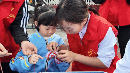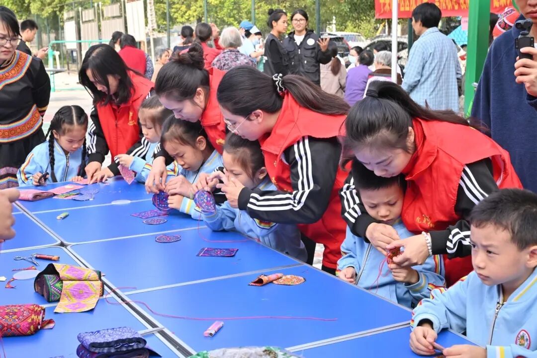 在非遺文化體驗(yàn)區(qū)的長桌上,擺放著各類布料及各色絲線、針插。志愿者手把手耐心教孩子們穿針引線,指導(dǎo)平針縫制技巧;站在一旁的老人也主動提供幫助。孩子們小心翼翼地堅(jiān)持制作,最終完成略顯稚嫩卻可愛的布藝作品。
