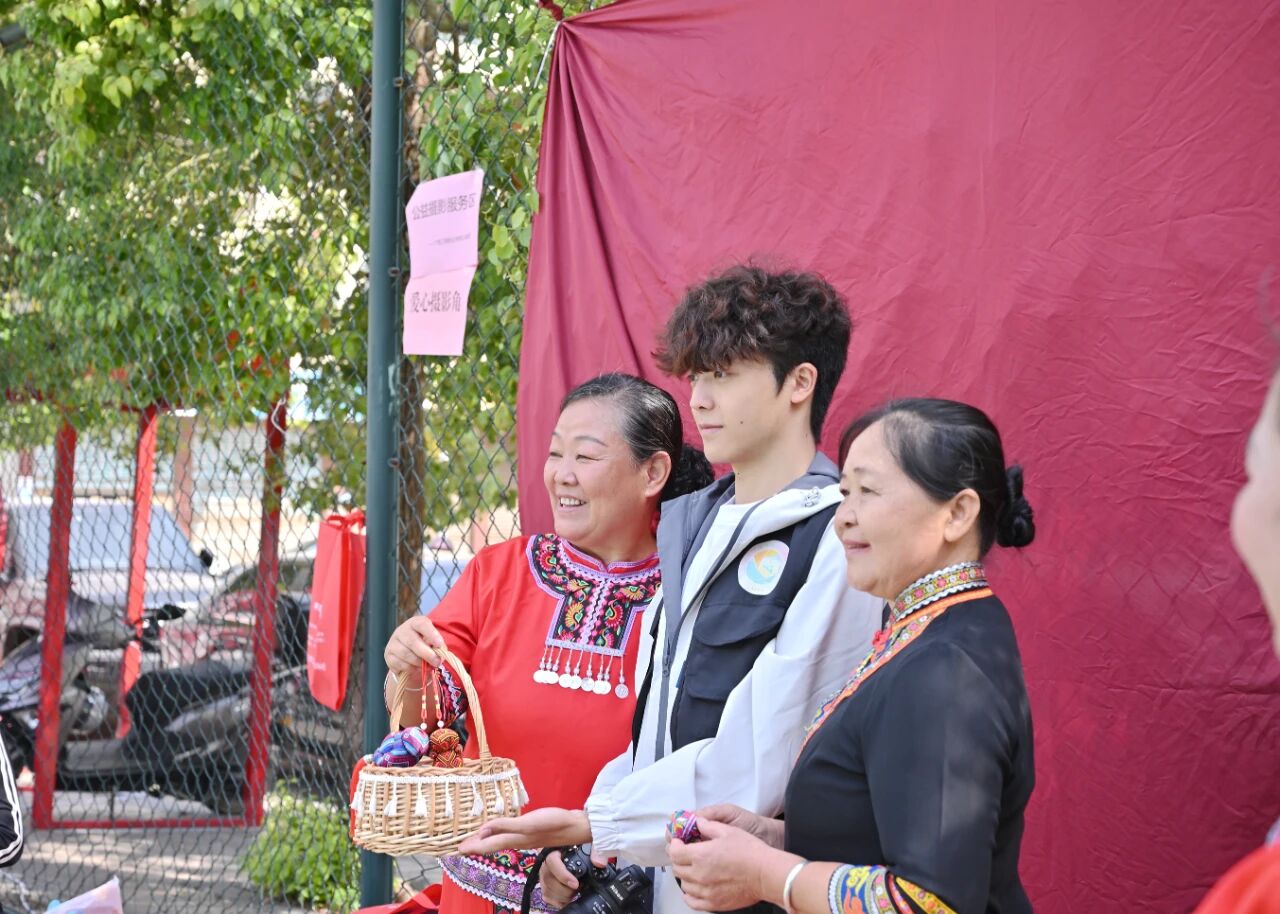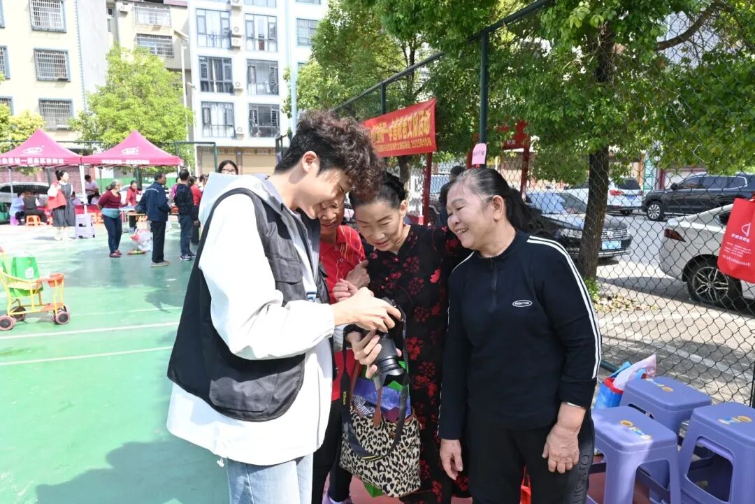 志愿者們?yōu)槔先伺恼?/div> 志愿者們主動上前,有的陪老人拉著家常,話里話外滿是親切;有的舉著相機(jī)為老人定格美好瞬間,耐心調(diào)整角度。他們的每一個(gè)抬手、每一次對視,都藏著滿滿的關(guān)愛與敬重。