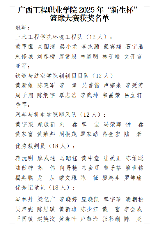 歷經(jīng)一段時間的激烈比拼,12月11日,廣西工程職業(yè)學院2025年“新生杯”籃球大賽在體育館迎來圓滿收官。