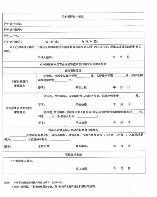 3.兩種學(xué)費(fèi)資助申請(qǐng)表均需要學(xué)生本人用賬戶密碼登錄全國(guó)征兵網(wǎng)進(jìn)行填寫(xiě),完成填寫(xiě)后才能從系統(tǒng)上下載并打印。從其他網(wǎng)站或其他渠道找到表格模板來(lái)填寫(xiě)并打印的無(wú)效。