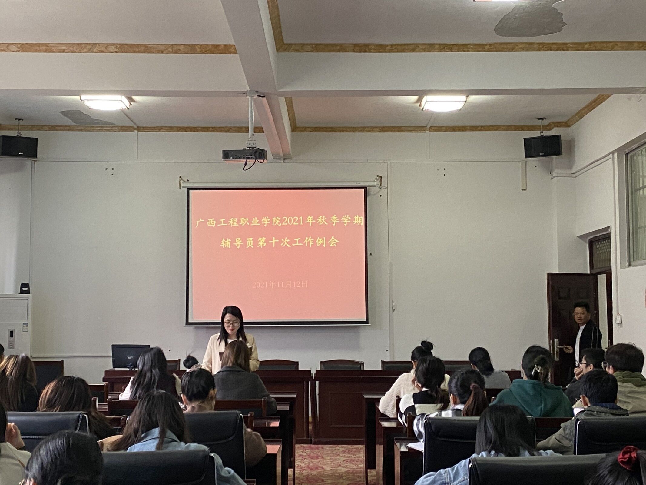 2021年11月12日,學(xué)生工作處在舊圖書館學(xué)術(shù)報(bào)告廳召開本學(xué)期第十次輔導(dǎo)員工作例會(huì),本次會(huì)議由校長(zhǎng)助理黃秋霞主持,學(xué)生工作處全體人員、二級(jí)學(xué)院負(fù)責(zé)人、學(xué)生科長(zhǎng)及全體輔導(dǎo)員參加。