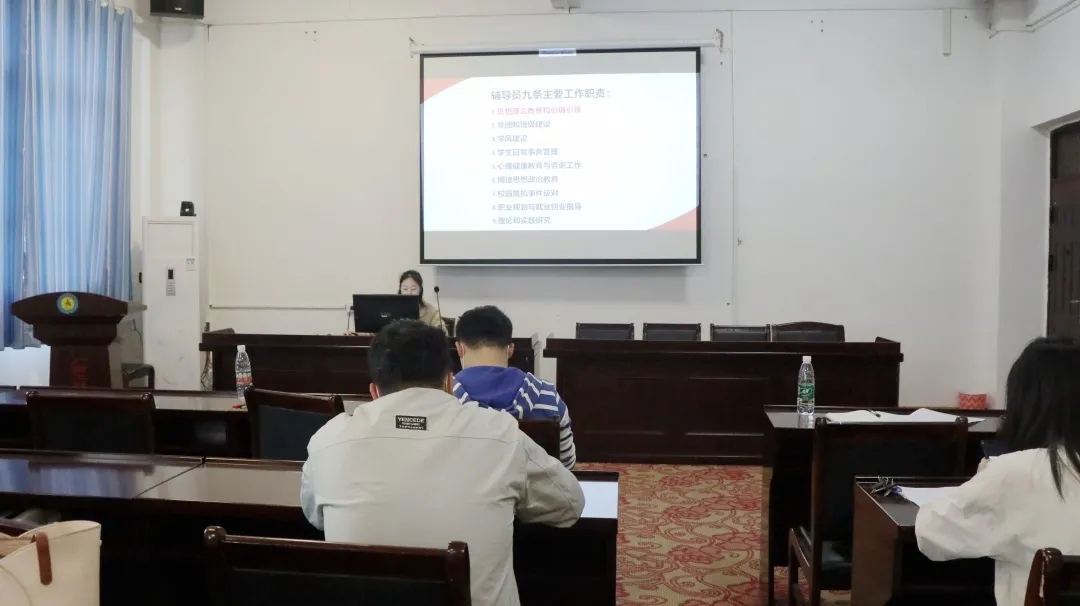 覃蘭蘭老師就輔導(dǎo)員九條工作職責(zé)及談心談話技巧進行了經(jīng)驗交流
