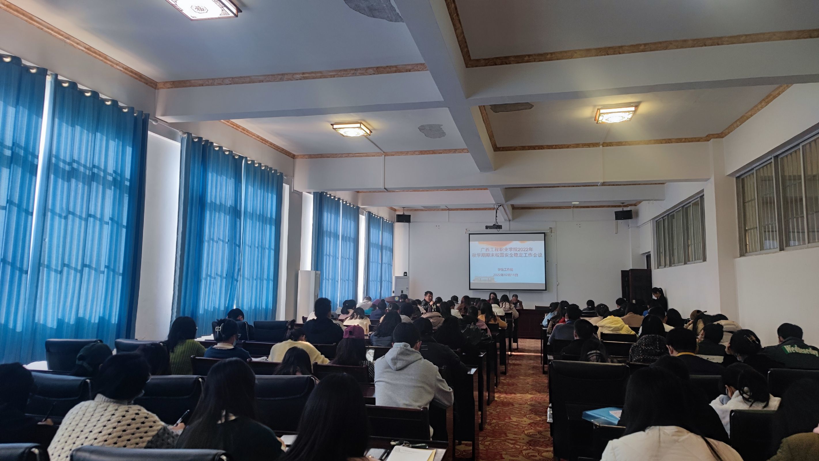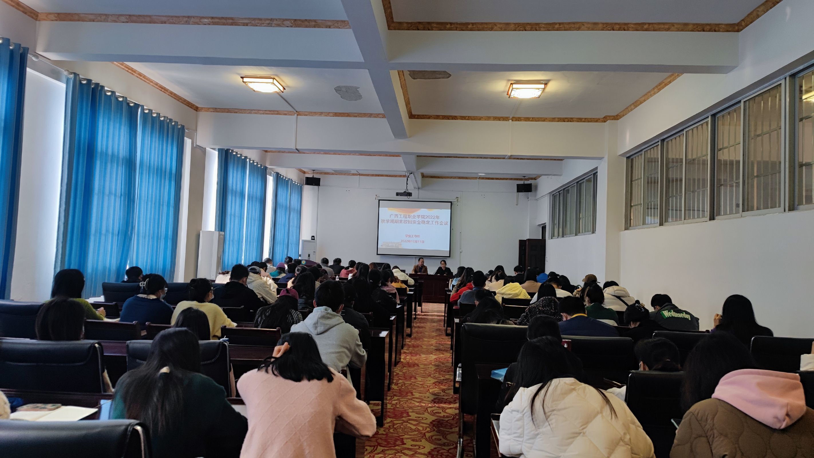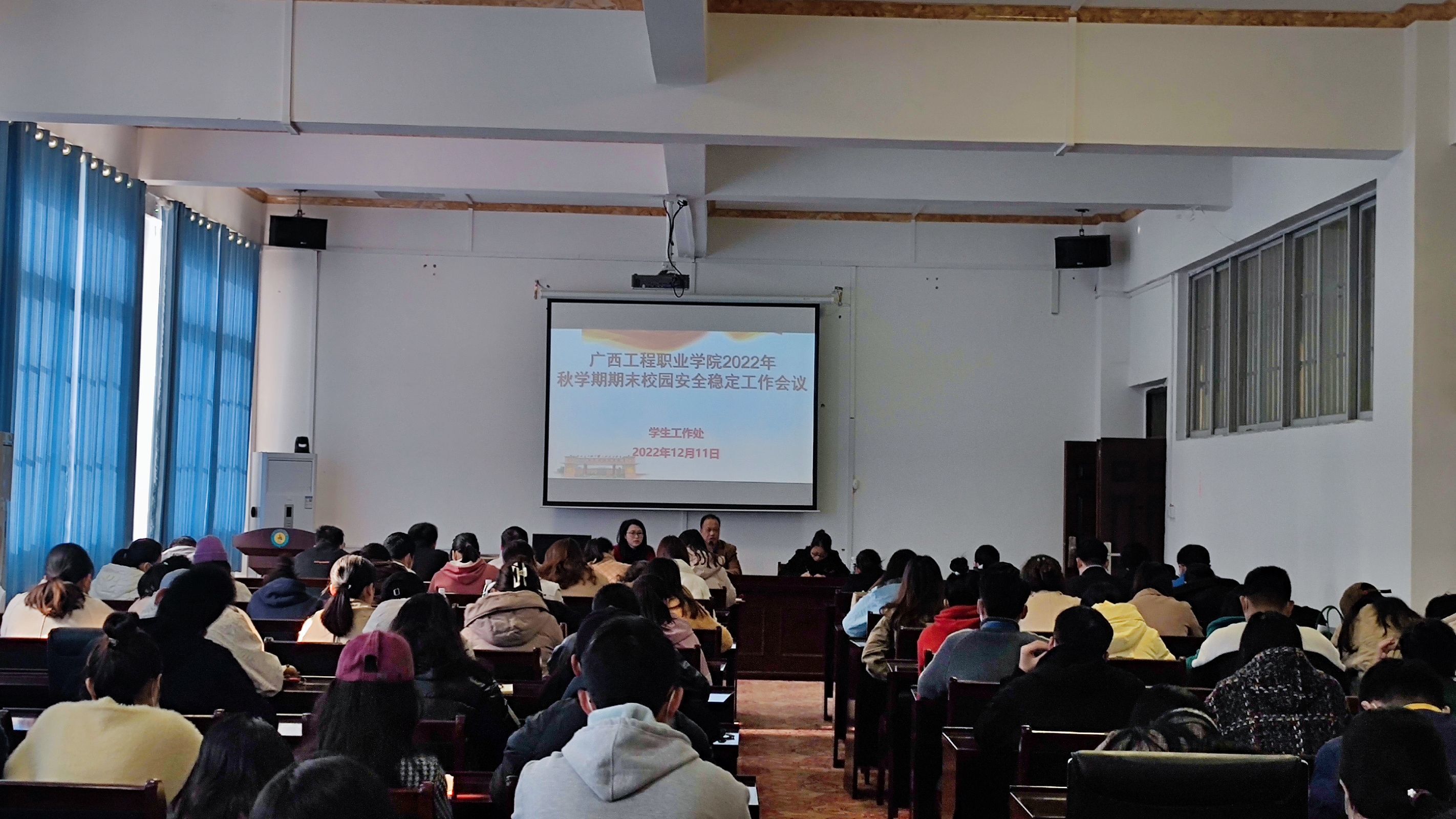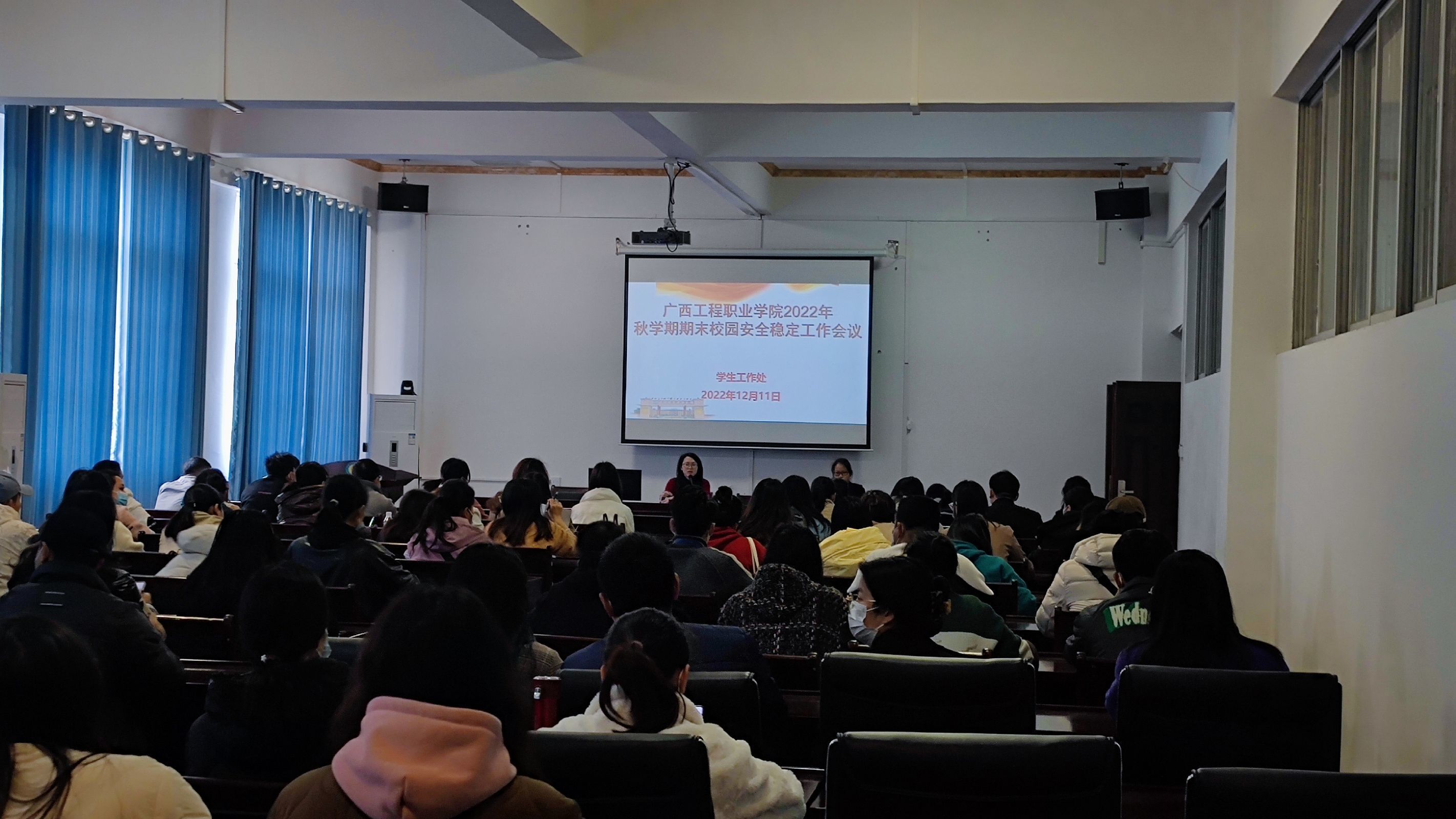 12月11日,我校學生工作處在圖書館一樓學術報告廳召開2022年秋學期期末校園安全穩(wěn)定工作會議,學校董事長李益、學校黨委副書記黃秋霞、學生工作處副處長李麗詩、二級學院院長、科長、副書記、輔導員參加會議。會議由學生工作處副處長李麗詩主持。