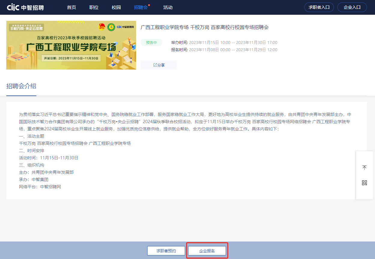 在企業(yè)后臺進入“招聘會”模塊,選擇本次招聘會,點擊“報名參會”后進行“添加職位”完成報名。