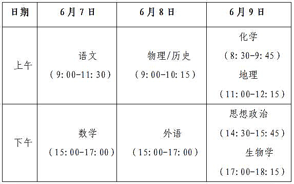 (二)考試時(shí)間。全國(guó)統(tǒng)考科目由教育部命題,按教育部規(guī)定時(shí)間組織考試。選擇性考試科目由我區(qū)自主命題,每門(mén)考試時(shí)長(zhǎng)均為75分鐘,與全國(guó)統(tǒng)考科目的考試同期安排,如全國(guó)統(tǒng)考科目有調(diào)整,選擇性考試科目的考試安排相應(yīng)調(diào)整。具體考試時(shí)間安排如下: