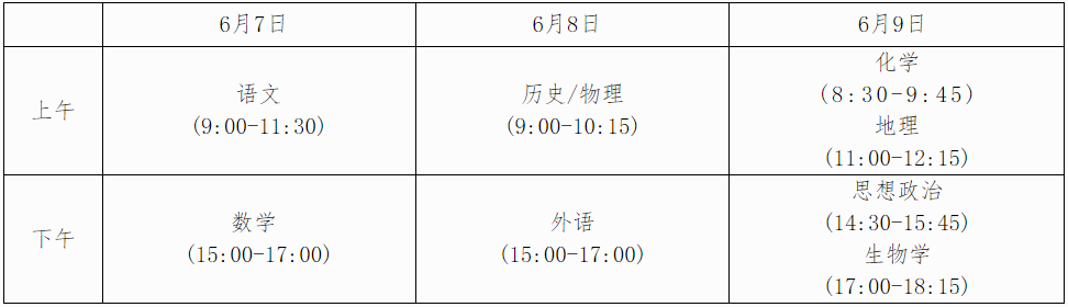一般安排在6月7日—9日進行,時間由改革前的2天調(diào)整為改革后的3天。全國統(tǒng)考科目考試時長與改革前相同:語文科目考試時長為150分鐘,數(shù)學(xué)、外語科目考試時長均為120分鐘;每門選擇性考試科目考試時長均為75分鐘。